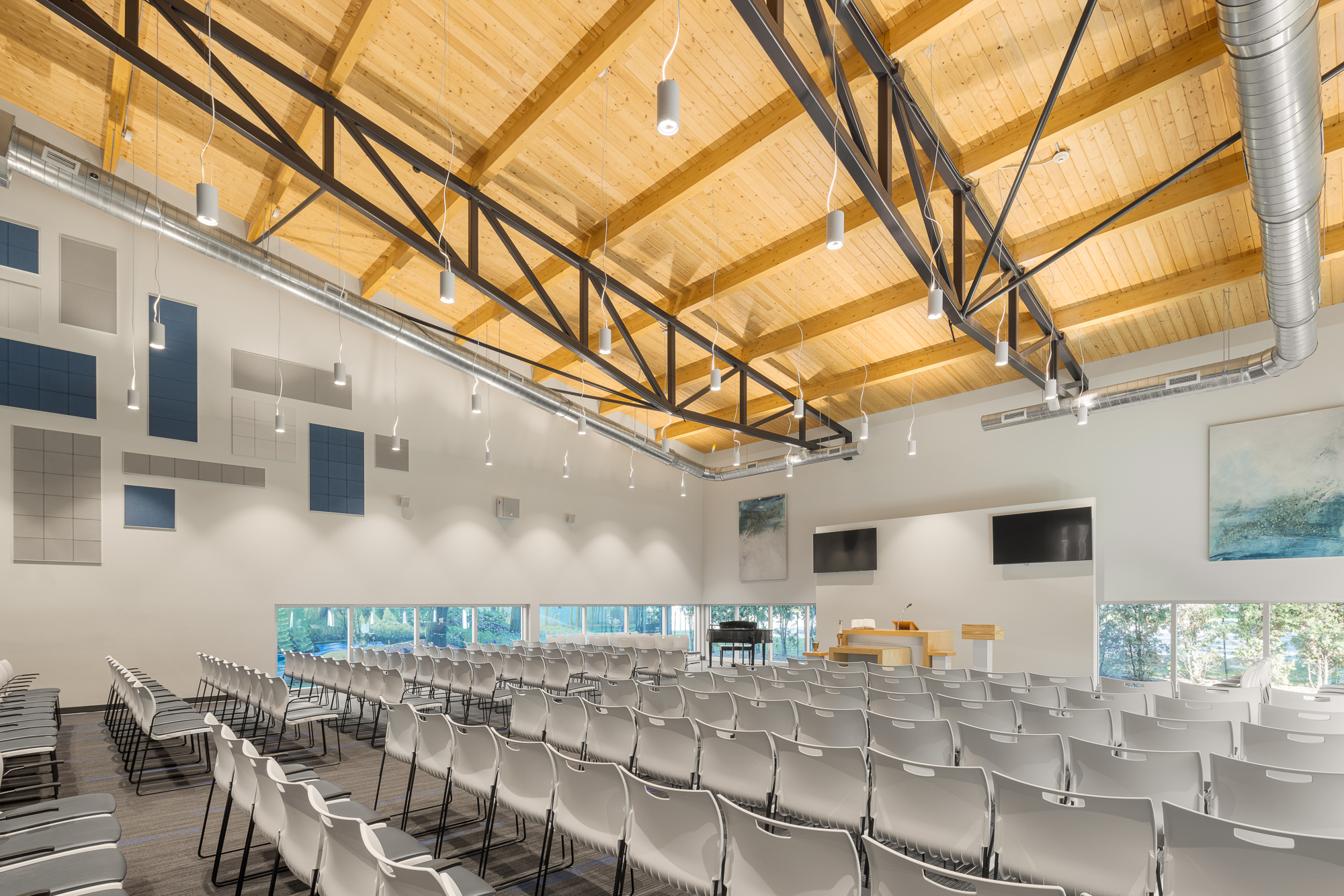 L’emploi de poutres apparentes en bois lamellé recouvert de pin embouveté, le positionnement réfléchi des ouvertures favorisant l’entrée de lumière naturelle tout en préservant l’intimité des lieux, ainsi que le choix de matériaux nobles, ne sont que quelques-uns des éléments de conception qui confèrent au bâtiment une architecture à la fois fonctionnelle et adaptée à son usage.